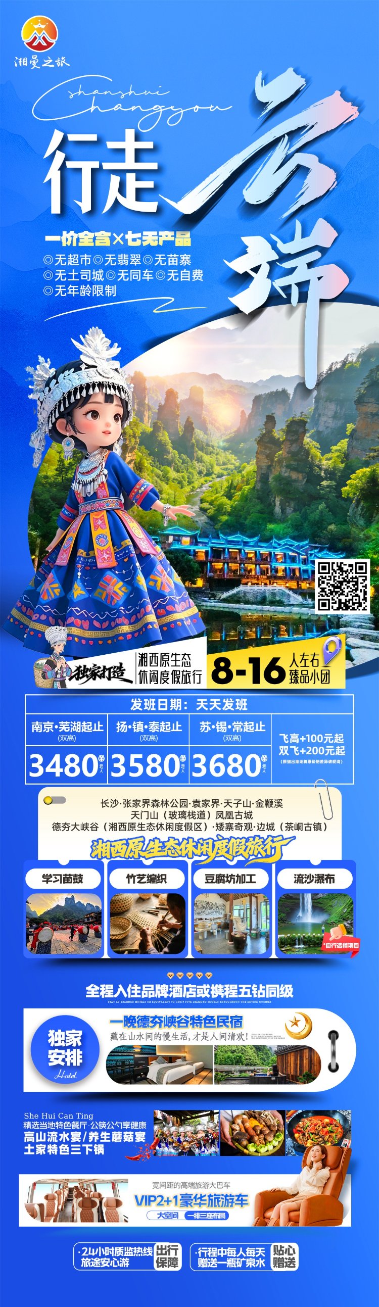 清晨被清脆鸟鸣唤醒,晨光漫过山脊,薄雾轻缠苍翠绿意,湘西的灵韵,便藏在德夯的云雾里。驷马峰如四位远古巨人,以刀削斧劈之姿刺破苍穹,守护着苗疆最原始的密语。晨光掠过山巅时,瀑布自崖壁飞泻而下,宛若银河垂落——这里是《边城》里未完的章节,是大地用亿万年时光镌刻的狂草诗行,漫步古朴村寨,可在豆腐坊亲手体验传统食材加工的乐趣;在专业大师傅的手把手指导下,学习苗鼓,苗鼓,是会说话的神物,在苗乡,无鼓不成寨,无人不敬鼓;所有非遗体验的成品均可带走,留存一段苗疆专属的记忆。群山环抱间,流沙瀑布(可选乘电瓶车往返18元/人),如银练倾泻,水雾氤氲,恍若仙境。216米的落差让水流裹挟着磅礴气势撞向岩壁,溅起漫天水花,阳光洒落时,一道绚丽彩虹凌空架起,让人不由得想起李白“飞流直下三千尺,疑是银河落九天”的千古名句。中餐后乘车前往【矮寨奇观景区AAAAA】(景区电瓶车、观光电梯费用已含),抵达后参观当年楚国诗人屈原含悲问天谱写中国伟大诗章《九歌》《天问》的地方—【天问台】,人立台上,顿感天地之伟大,人类之渺小。后换乘景区环保车前往游览--世界十大非去不可的新地标—【矮寨悬索大桥景区】,前往游览体验悬崖【魔鬼悬崖玻璃栈道】,它是由悬崖栈道与观景平台组成的高空游览线,全长1.5公里,位于德夯大峡谷峭壁之上,采用现代设计语言,萃取“蝴蝶”、“飘带”等苗族文化元素,形成戏剧性“跌宕起伏”、“惊心动魄”的旗帜性游览步道系统。游览悬崖栈道时不仅可以欣赏到山高谷深、崖陡壁俏、林深路幽、巍峨险峻的武陵山脉中最精彩、最险峻、最梦幻的地段,还可以体验由玻璃魔道带来的视觉刺激、冲击游人接受极限的潜能。车程1小时前往“一脚踏三省”,沈从文先生笔中的【边城.茶峒】,沈从文先生把茶峒古镇优美的风景、淳朴善良的风俗人情等融为一体,勾画出了田牧歌般的边城风貌:依山的筑城茶峒,临水的码头,湾泊的乌篷船,轻柔的山风,望眼无尽的翠竹,青石道整洁风雅,吊脚楼古色古香,白塔立:古渡摆舟;垂柳下的石阶上,仨俩姑嫂在捶衣洗菜,清水江上,四五渔民在放鹭鸶叼鱼,如诗如画、美轮美奂。打卡“一脚跨三省”的交界碑(拉拉渡费用已含),欣赏河两岸边城风光。专用BUS赴神秘湘西深处【凤凰古城AAAAA】体验和感受凤凰古城的九大精华:一座青山抱古城、一泓沱水绕城过、一条红红石板街、一道风雨古城墙、一座雄伟古城楼、一个美丽彩虹桥、一排小桥吊脚楼、一批闻名世界的人、一个国家级非遗文化遗产。在美丽的沱江两岸欣赏【七重水幕灯光秀】,她是中国首个以苗族文化为故事线的夜游大作。以呈现苗族文化为核心,将国画、动漫、真人实拍、电影视听、实景搭建、夜游装置、光影设备等多种表现形式进行巧妙融合,感受灯火阑珊之凤凰,和烟雨凤凰!(如遇堵车、沱江水位过高或过低,大风暴雨等恶劣天气及特殊原因会停演不能正常观看,赠送项目无退费)